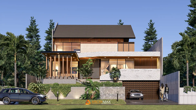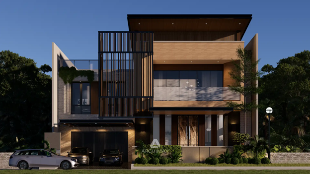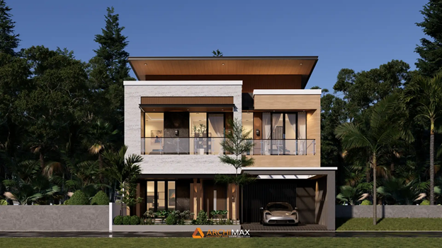 Secara keseluruhan, desain ini mencerminkan konsep rumah modern yang tidak hanya indah, tetapi juga ramah lingkungan, memenuhi kebutuhan gaya hidup modern dengan kehangatan nuansa alam.