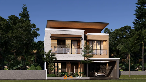 Di artikel ini kami akan memberikan referensi inspirasi desain rumah menunjukkan desain rumah modern minimalis yang memadukan elemen estetika kontemporer dengan nuansa alam. Rumah dua lantai ini dirancang dengan gaya arsitektur yang elegan dan fungsional, menawarkan kenyamanan serta estetika yang menawan.